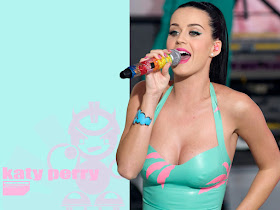 Wallpaper with Katy Perry in a blue sexy tight dress singing for an audience